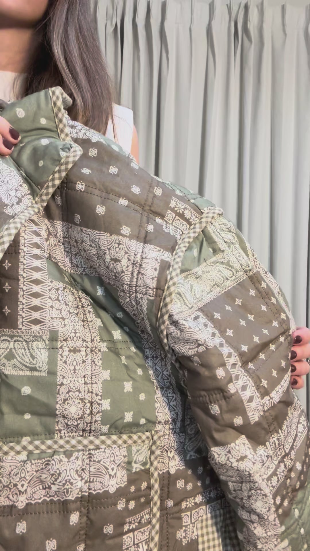 Olive green and off white patchwork quilted long sleeve jacket. Features buttons closures in front. Has contrast gingham binding on hems. Two functional pockets in front.