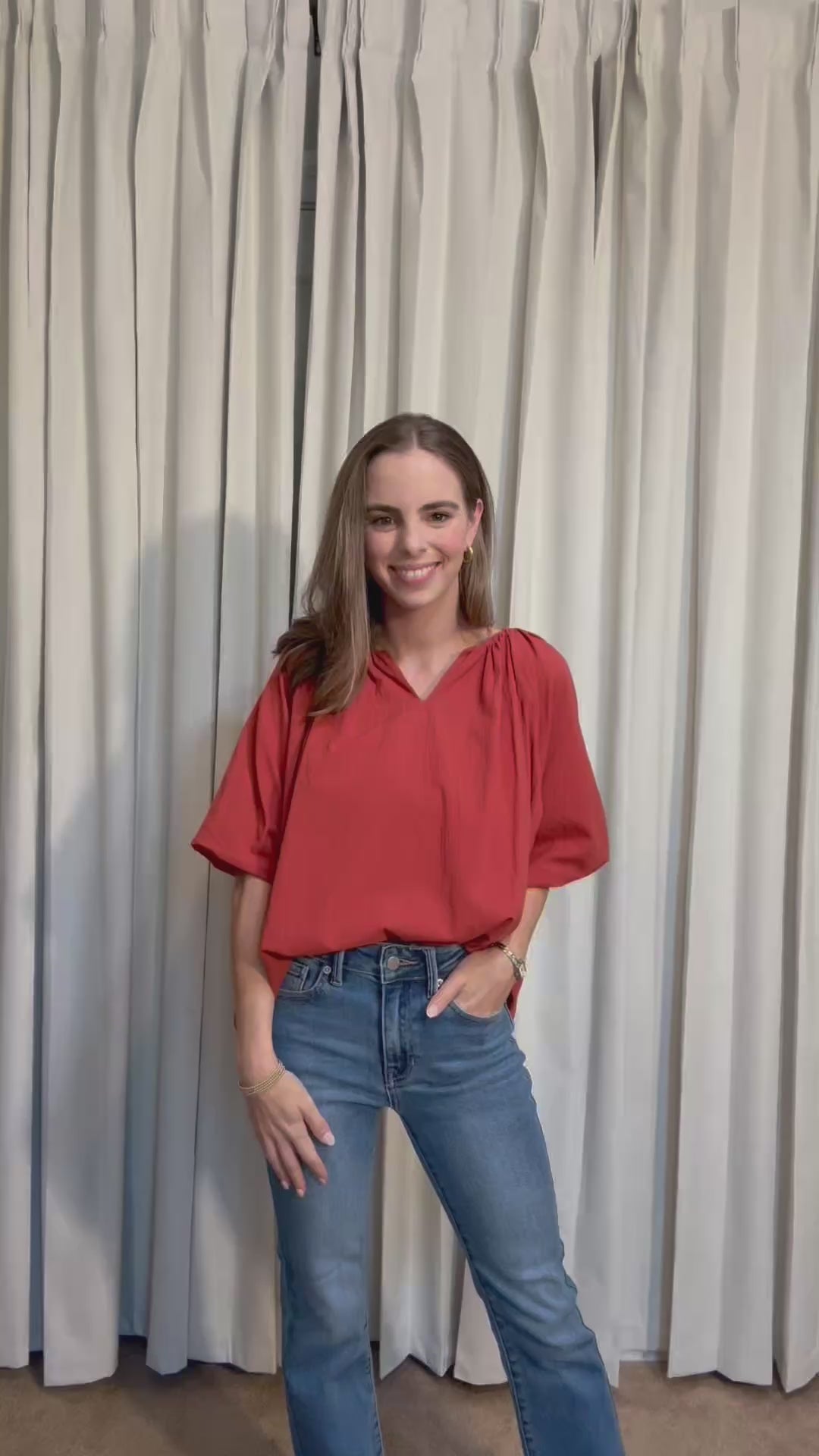 The Betsy Top in brick is your new fall favorite! With its charming puffed sleeves and v-neckline, this top brings just the right amount of fun to your wardrobe. The gathered neckline adds a sweet touch. Pairs perfectly with crop flare jeans and booties for an effortlessly look. Embrace the season with this classic staple! If sometimes in between sizes in the bust area, I’d recommend going up!